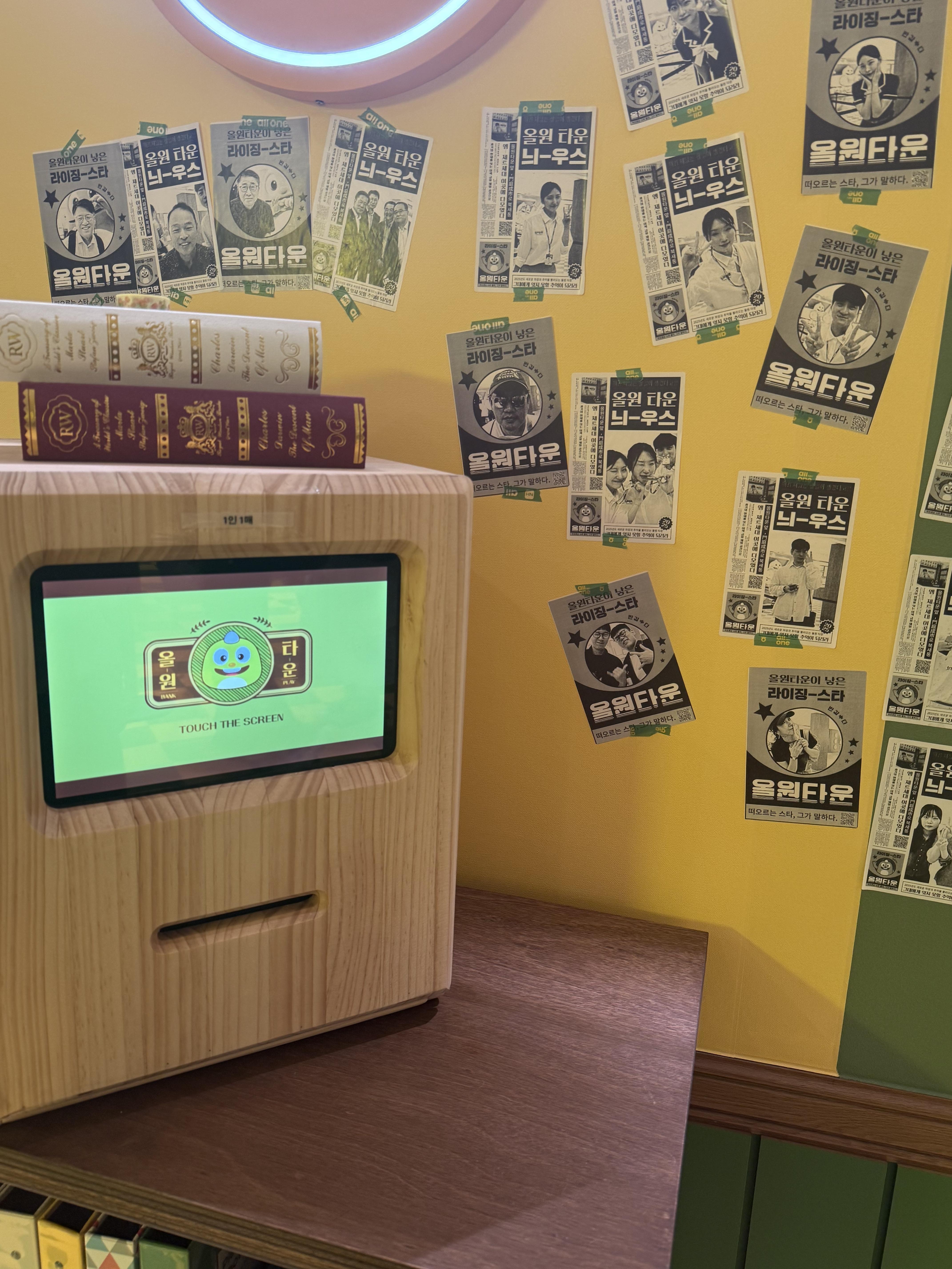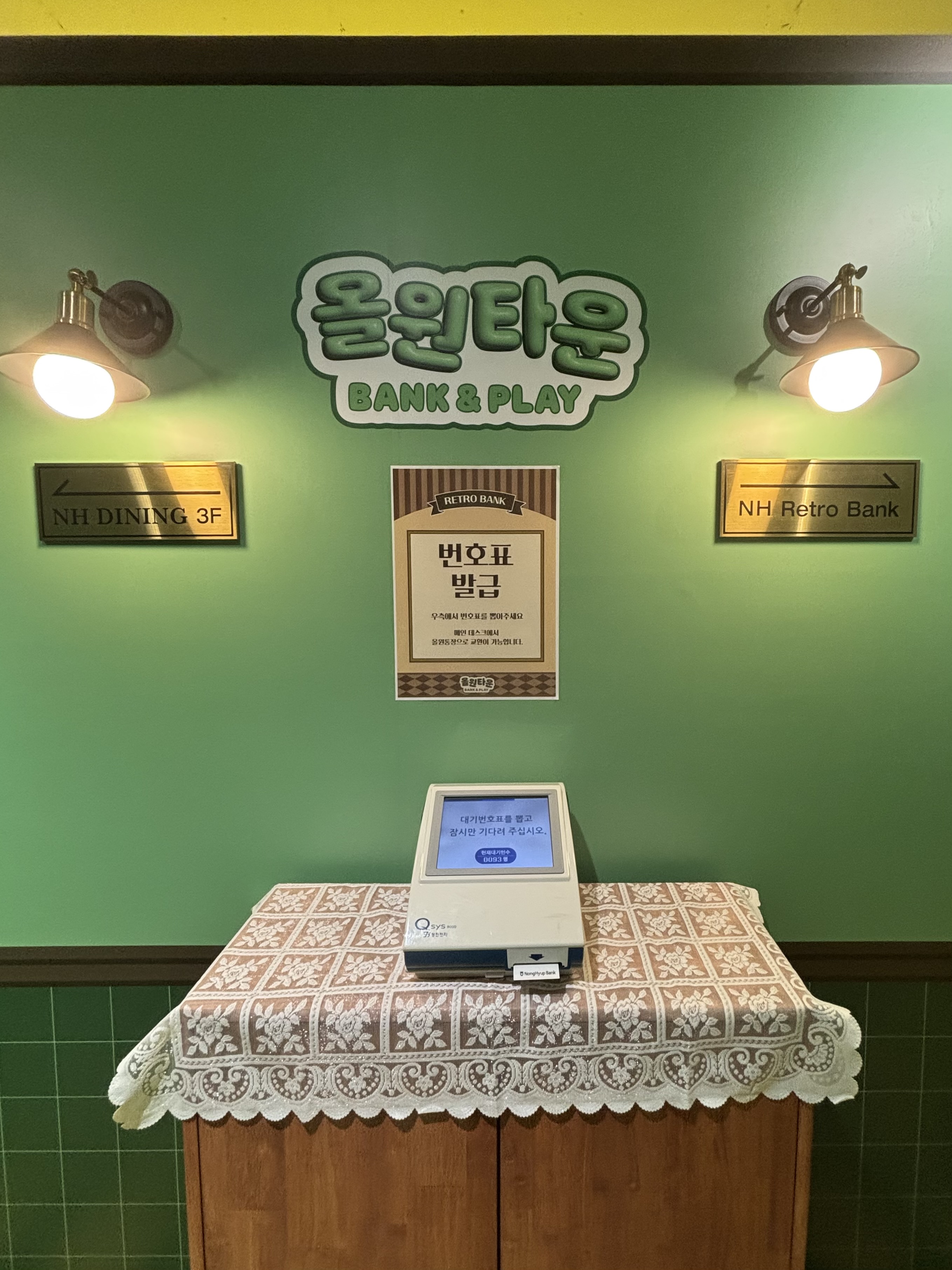 팝업 내부로 입장하자 레트로 감성이 반영된 은행 인테리어가 방문객을 '올원타운'의 세계관으로 몰입시켰습니다. 입장을 할 때, 은행의 대기표를 뽑는 것처럼 번호표를 뽑고 메인 데스크에서 '올원 통장'을 발급받을 수 있었습니다. 요새 은행을 직접 갈 일이 없고 업무를 앱이나 인터넷으로 하다 보니, 번호표를 뽑고 통장을 발급받는 과정과 레트로하게 꾸며진 공간을 보니 정말 오랜만에 은행에 온 기분이라 시작부터 '레트로 뱅크존'이라는 걸 체감할 수 있었습니다. 메인 데스크 직원의 친절한 응대와 테마에 맞춘 복장 또한 이러한 몰입을 돕는 요소였습니다.