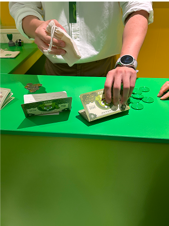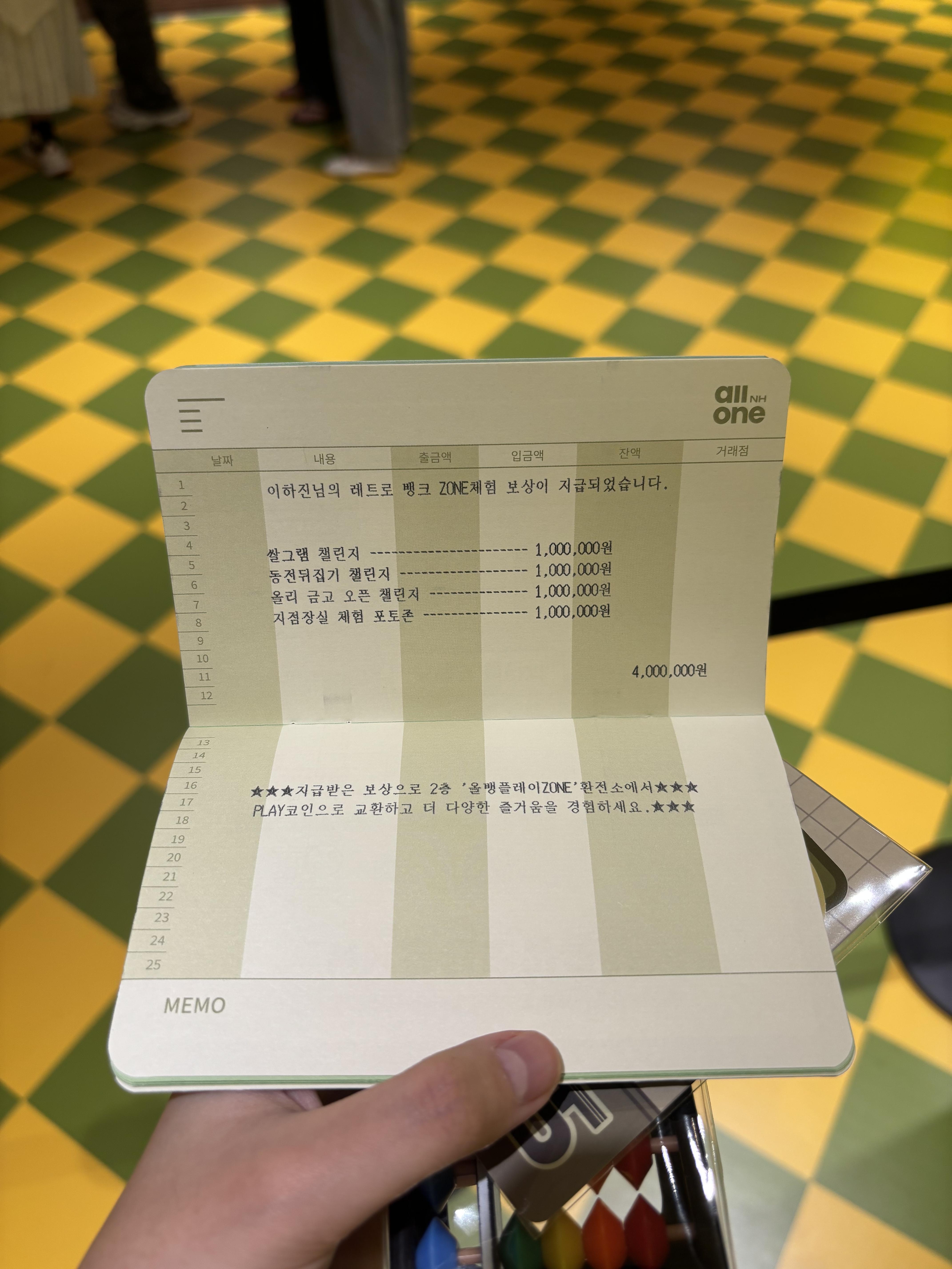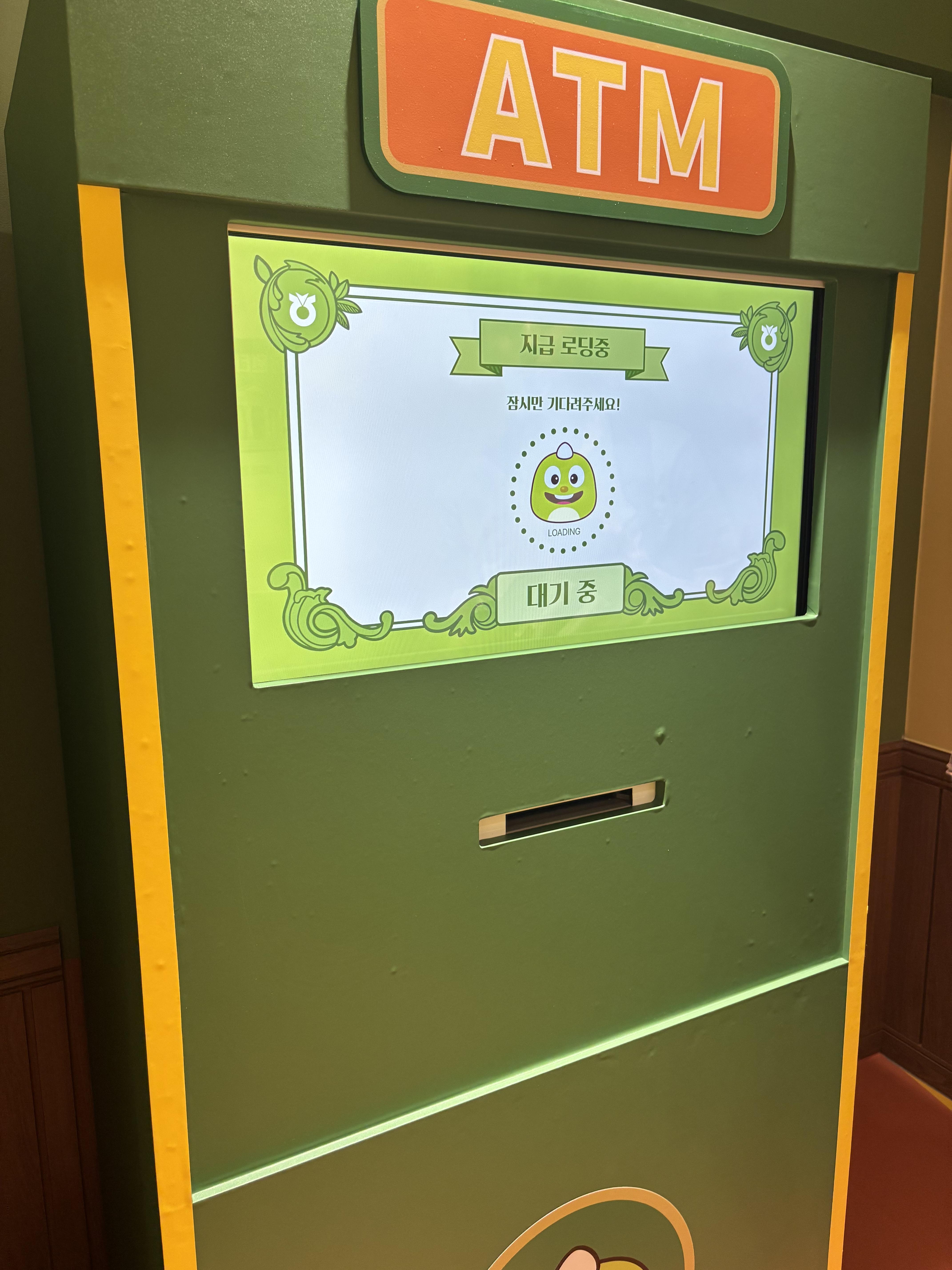 이렇게 4개의 체험을 마친 후에는 '통장 정리'를 할 수 있었습니다. ATM 기계에 통장을 넣으면 가상의 보상금 400만원이 쌓여, 실제로 월급을 받은 것처럼 뿌듯함을 느끼게 해주었습니다. 이 보상금은 2층 환전소에서 코인으로 교환하여 2층에 준비된 게임을 즐기는 데 사용되었습니다.