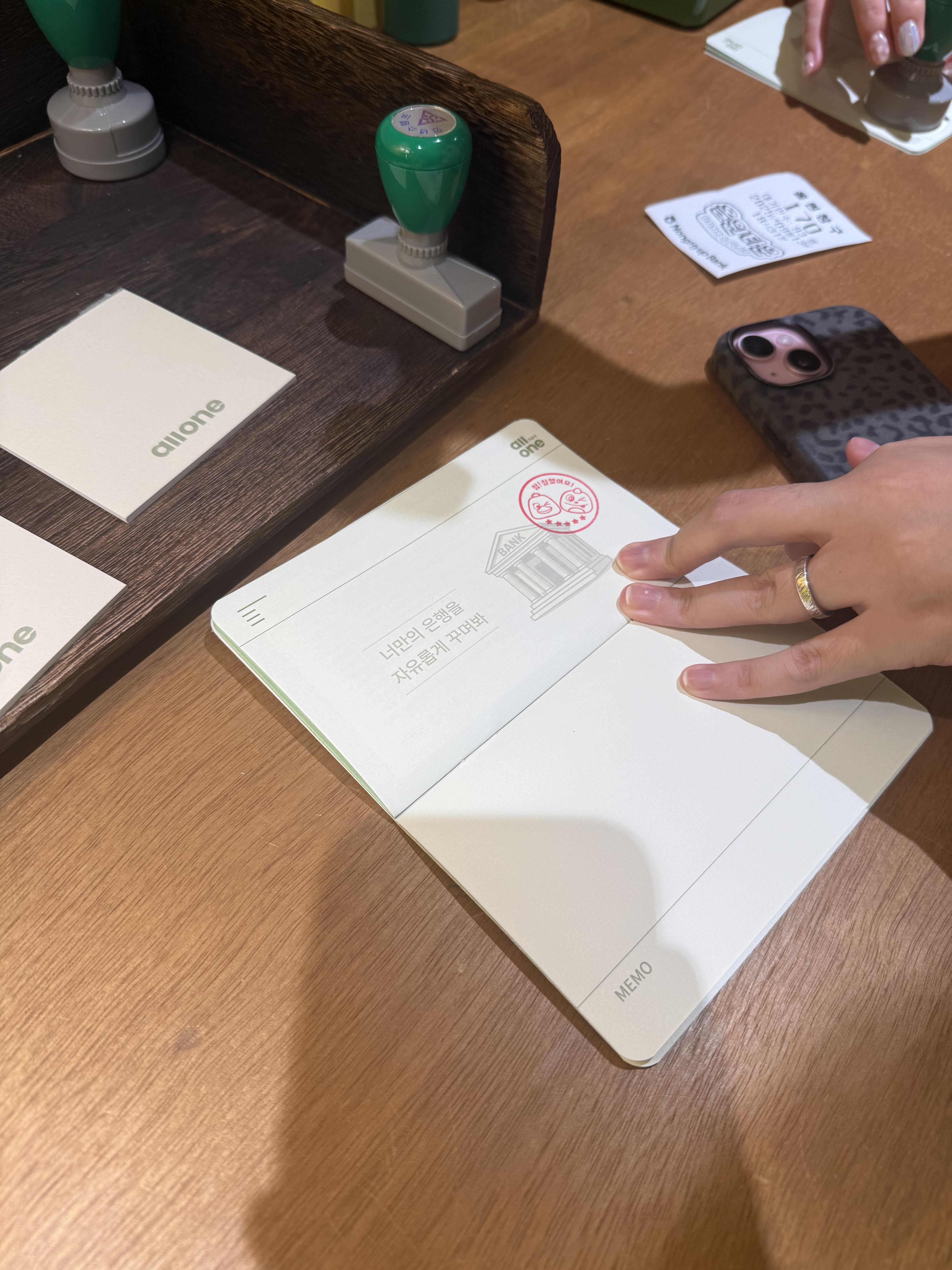 발급받은 통장을 들고 좌측 스탬프존에서 나만의 통장을 꾸밀 수 있었습니다. 통장에 스탬프를 찍어 개인의 취향을 더하는 행위는 방문객의 개인화 욕구를 충족시키며, 대상에 노력을 기울일수록 그 가치를 높게 평가하게 되는 심리적 메커니즘이 작동합니다.