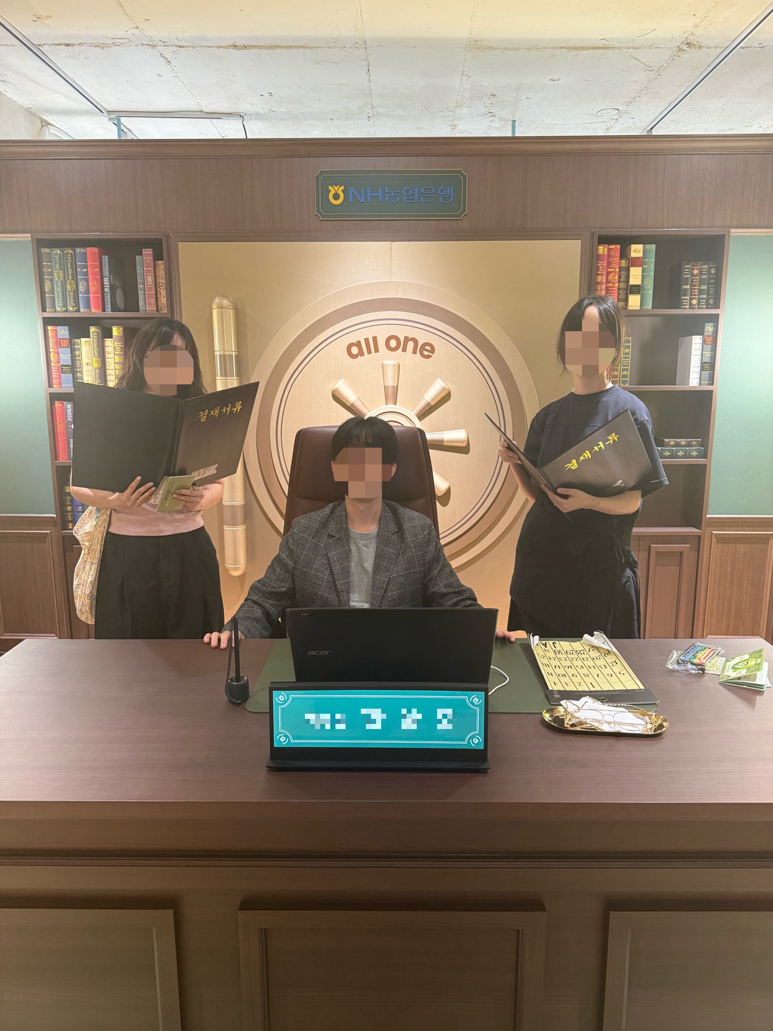 3개의 게임을 마친 후 마지막으로는 내 이름을 넣고 지점장 옷을 입고 사진을 찍을 수 있는 포토존이 마련되어, 찍고 나면 은행의 일원이 된 듯한 기분을 느낄 수 있었습니다. 이는 방문객이 단순히 구경하는 것을 넘어 스스로 선택하고 통제한다는 느낌을 주는 자율성 부여와, 특정 역할이나 정체성을 부여하여 그에 부합하는 행동을 하도록 만드는 전략이 적용된 것입니다.